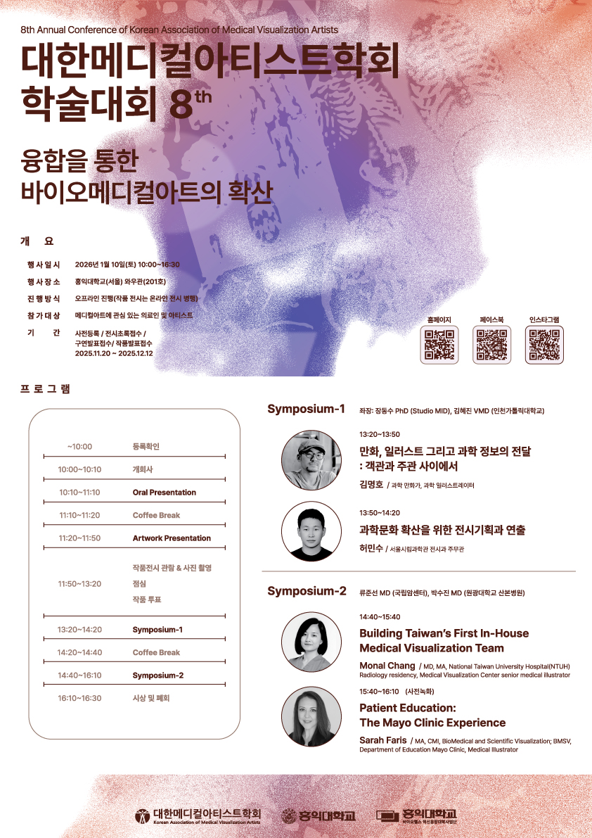 ■ 행사 : 제8회 대한메디컬아티스트학회 학술대회 ■ 주제 : 융합을 통한 바이오메디컬아트의 확산 ■ 대상 : 메디컬아트에 관심있는 의료인 및 아티스트 ■ 일시 : 2026년 1월 10일(토요일) 10:00~16:00 ■ 대회장 : 홍익대학교(서울) 와우관 201호 ■ 홈페이지(공식메인) : https://www.kamva.or.kr